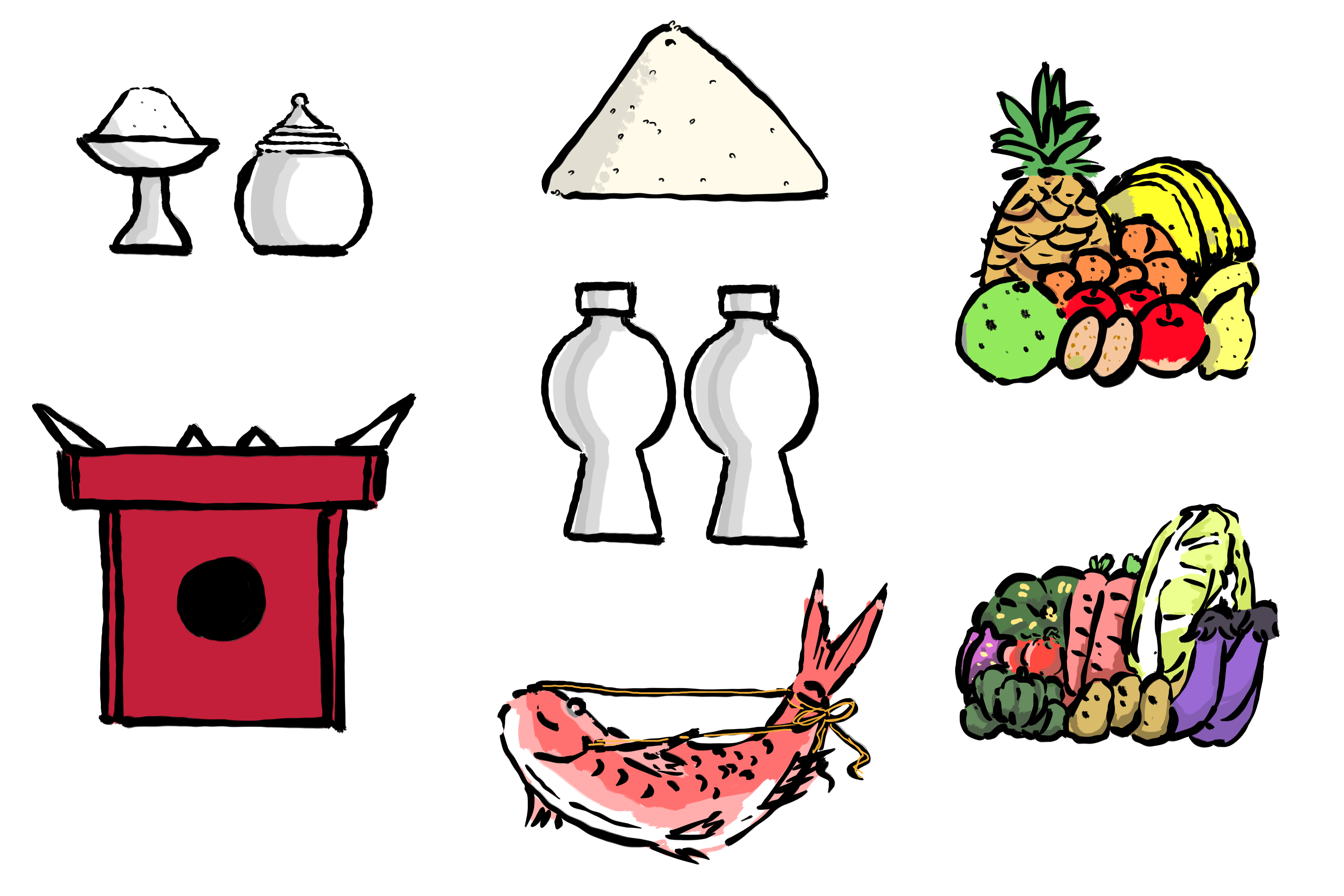 神様(地神、水神、烏枢沙摩明王、荒神)などにお願いし不浄を除き東西南北上下を清浄にしていただき善神を招きます。